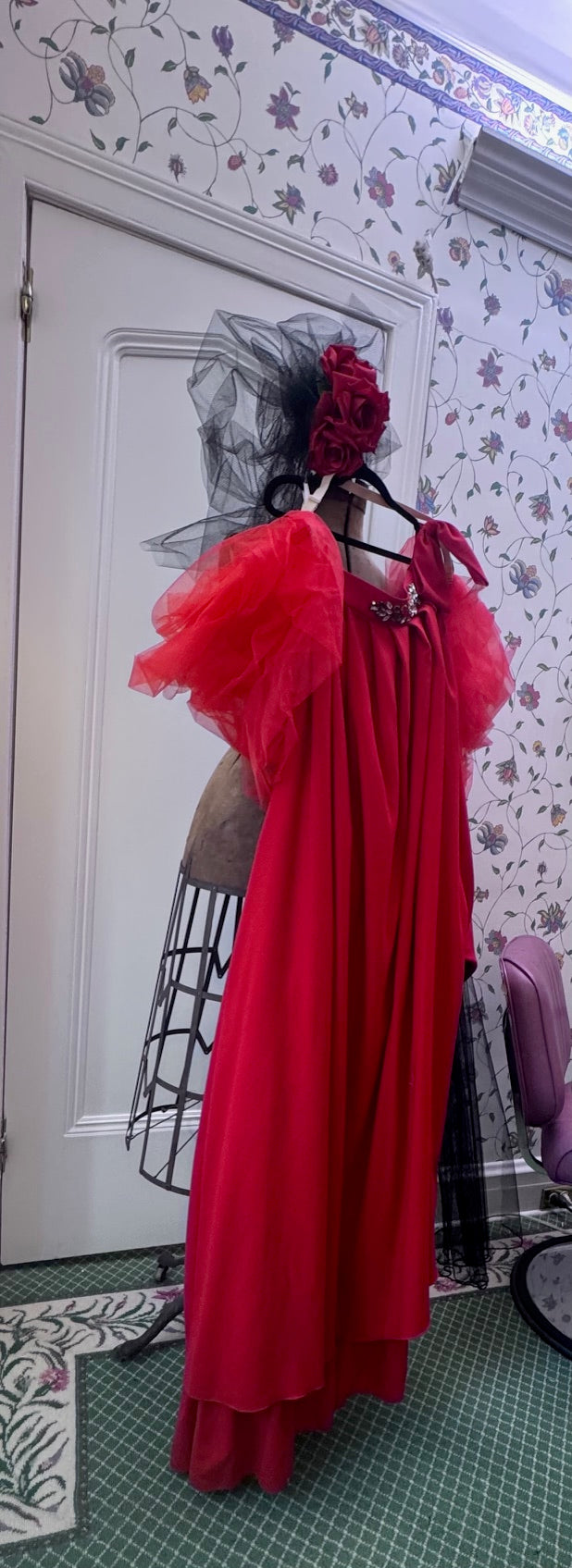 Wool crêpe, ruffle bow gown— with Jewel accents- red netted wrap - Size 2-4